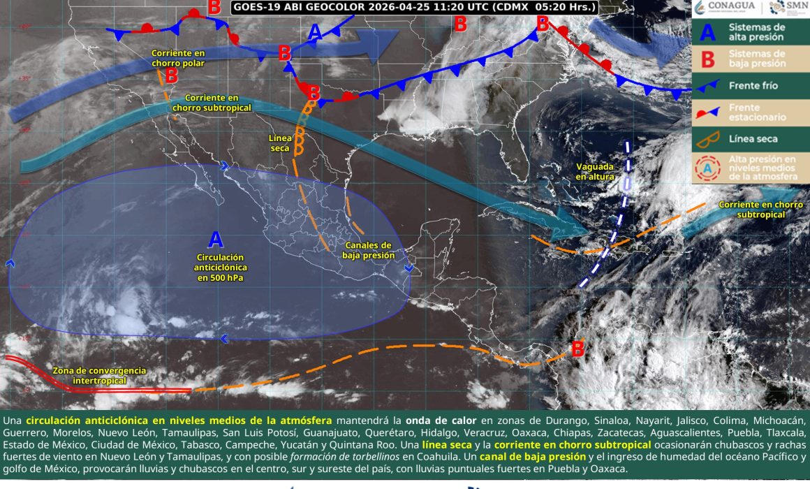 El SMN pronostica continuidad hasta el 28 de abril, con lluvias aisladas solo en norte y oriente. Esta circulación anticiclónica reduce nubosidad y eleva temperaturas en todo el interior.