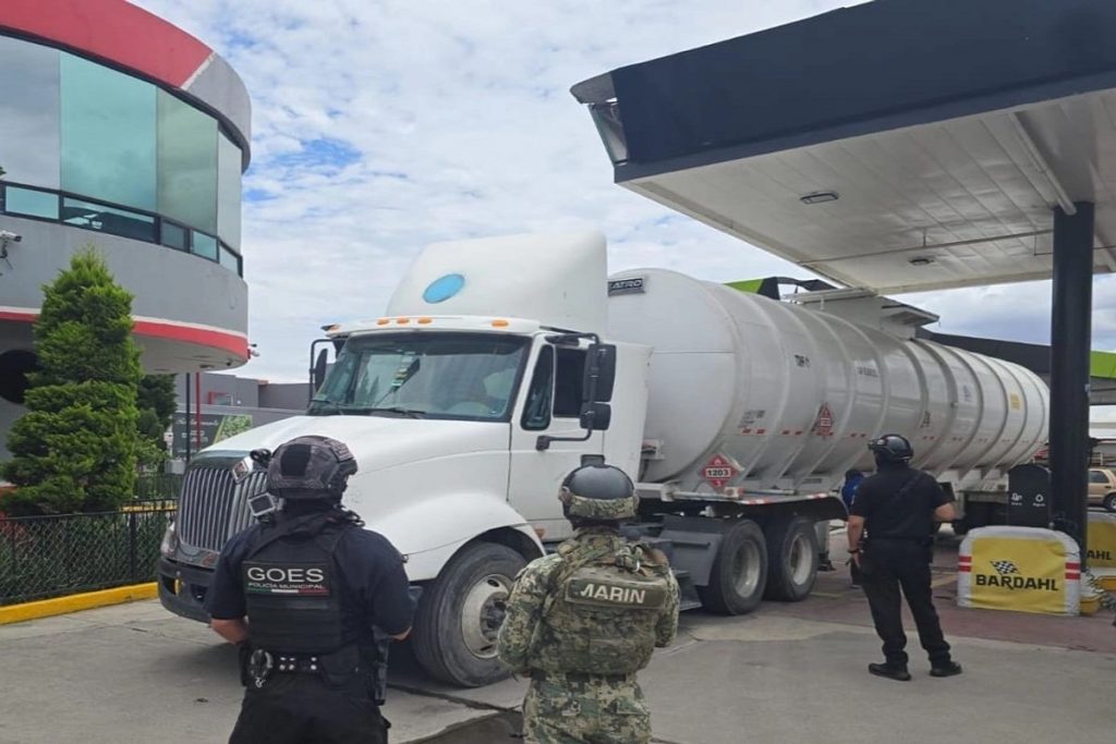 Durante la inspección, los oficiales encontraron una pipa sin razón social visible, marcada con las siglas S. P. F., estacionada dentro de la gasolinera. La unidad se encontraba en el área de cisternas realizando maniobras de descarga. Según los reportes, se trataba de un transporte con capacidad para 55 mil litros, presuntamente de origen ilícito.