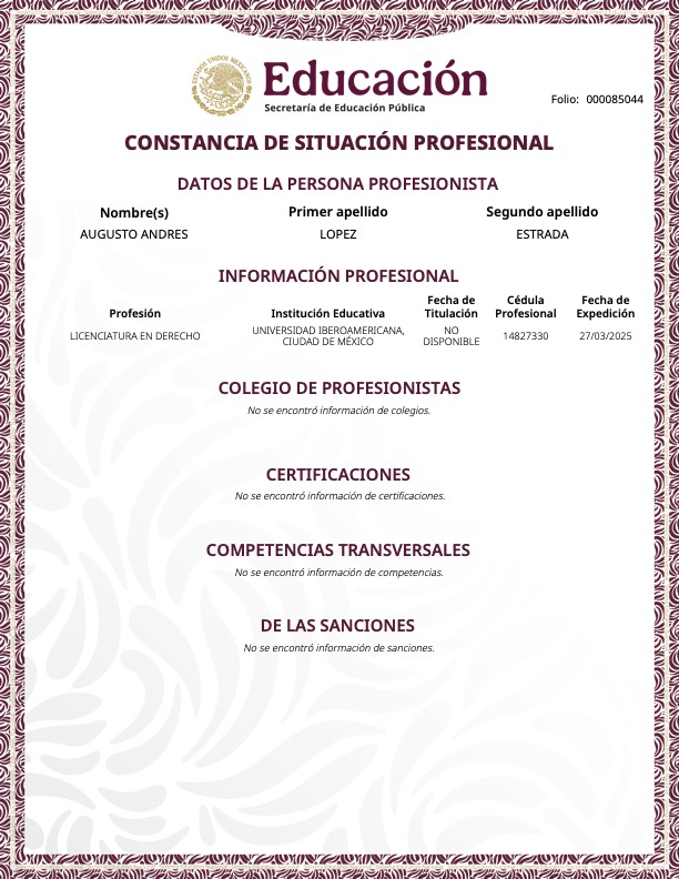El Registro Nacional de Profesionistas confirma que López Estrada obtuvo el título de licenciado en Derecho el 27 de marzo de 2025, casi un año después de concluir su contrato en la Cámara de Diputados.