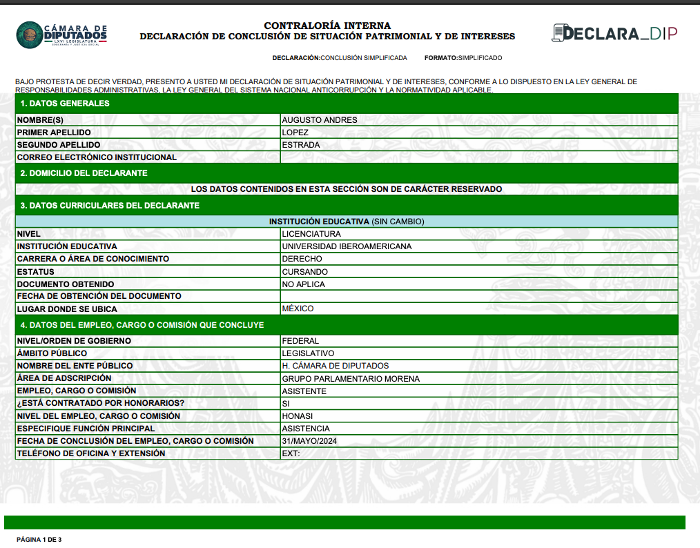 Augusto Andrés López Estrada, hijo del senador y exsecretario de Gobernación Adán Augusto López Hernández, fue contratado como asistente por honorarios en el Congreso de la Unión. Su contratación duró 23 meses, tiempo en el que recibió un pago bruto de 805 mil pesos, mientras cursaba la licenciatura en Derecho en la Universidad Iberoamericana. La información, obtenida a través de documentos oficiales presentados por la revista EMEEQUIS, confirma que el hijo de Adán Augusto en la Cámara de Diputados trabajó para el grupo parlamentario de Morena bajo una serie de contratos de prestación de servicios profesionales. En Cambio Diario te trae la información.