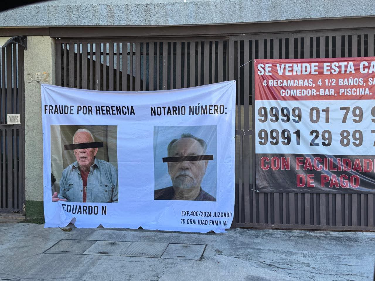 Uno de los nombres que aparece es “Eduardo N”, acompañado de un supuesto notario público. Ambos fueron acusados directamente en el texto de las lonas, donde se advierte a la ciudadanía sobre su presunta participación en un fraude.