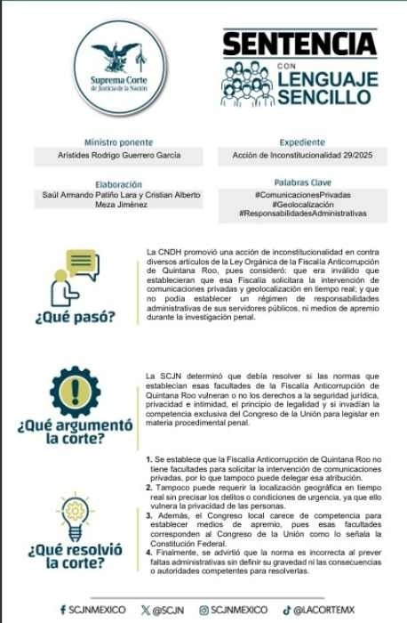 La Suprema Corte de Justicia de la Nación (SCJN) declaró inconstitucionales las facultades de la Fiscalía Anticorrupción de Quintana Roo para intervenir comunicaciones privadas y realizar geolocalización en tiempo real. La resolución marca un precedente histórico y reafirma que la FGE local no podrá espiarte, al considerar que tales prácticas violan el derecho a la privacidad.