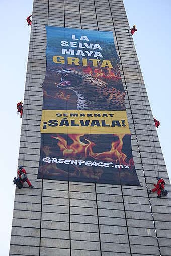 Greenpeace escala la Estela de Luz en CDMX y desplegó una manta de 27 metros para exigir a la Secretaría de Medio Ambiente y Recursos Naturales (Semarnat) acciones inmediatas que garanticen la protección de la Selva Maya.