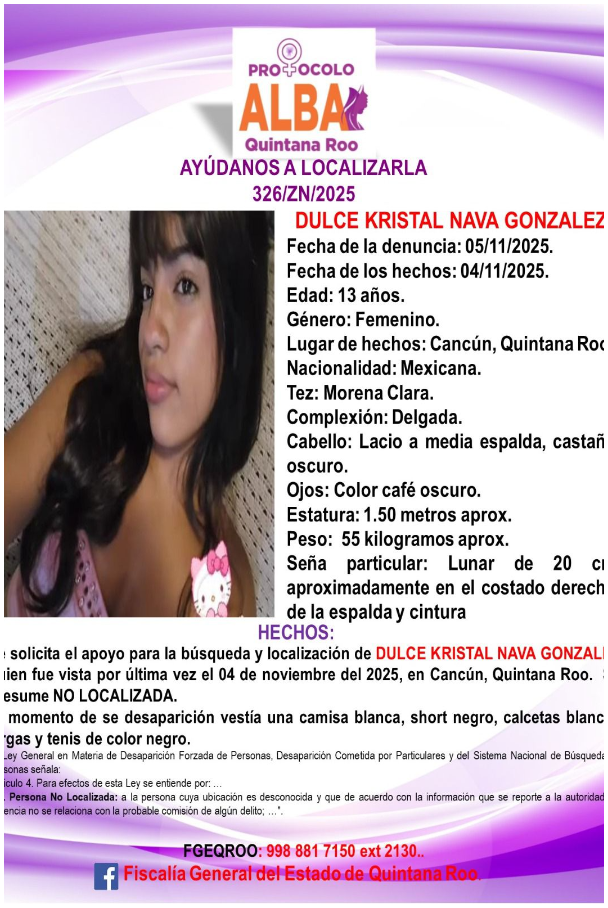 En la capital turística, buscan a 5 adolescentes y tres de ellas son originarias de Cancún. Se trata de Evelyn Amayrani Cruz Sansores (14 años), Dulce Kristal Nava González (13) y Shaday Burelo Zamora (12), cuyas fichas de alerta fueron activadas por desaparición en distintos puntos de la ciudad. Todas fueron vistas por última vez durante el puente del 1 al 4 de noviembre. Las autoridades piden a la ciudadanía reportar cualquier indicio que ayude a localizarlas.
