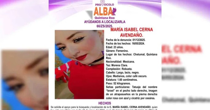 Buscan a María Avendaño en Chetumal. La Fiscalía General del Estado de Quintana Roo activó una ficha de búsqueda para localizar a María Isabel Cerda Avendaño, joven de 23 años que fue vista por última vez el 16 de mayo de 2024 en la ciudad de Chetumal, municipio de Othón P. Blanco.