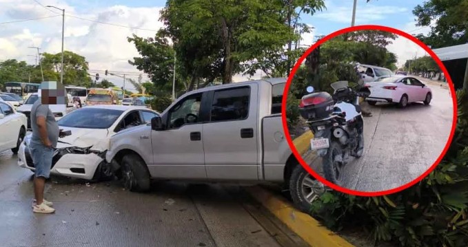 Carambola en la avenida Tulum deja tres vehículos dañados y una luminaria derribada, luego de que la mañana de este jueves el conductor de una Ford pickup color gris perdiera el control y provocara una colisión múltiple que involucró a tres vehículos y una luminaria pública. El incidente ocurrió alrededor de las 08:17 horas, entre las avenidas Sayil y Xcaret, en plena hora de mayor tránsito, generando congestión temporal en la zona.