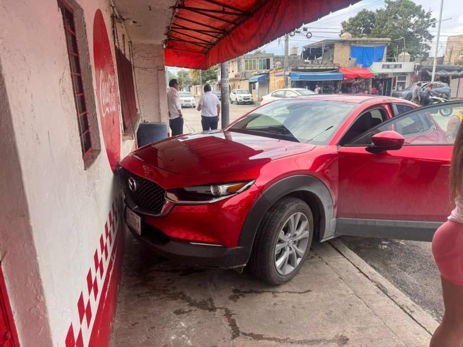 Choque entre camioneta y taxi pone en riesgo a vecinos en Colosio, Playa del Carmen, cuando una camioneta Mazda CX-5 fue impactada de costado por un taxi del sindicato Lázaro Cárdenas del Río en la intersección de la calle 62 con avenida 30. La conductora perdió el control del vehículo y montó la banqueta, quedando a centímetros de un negocio de comida. Afortunadamente, no se reportaron personas lesionadas.