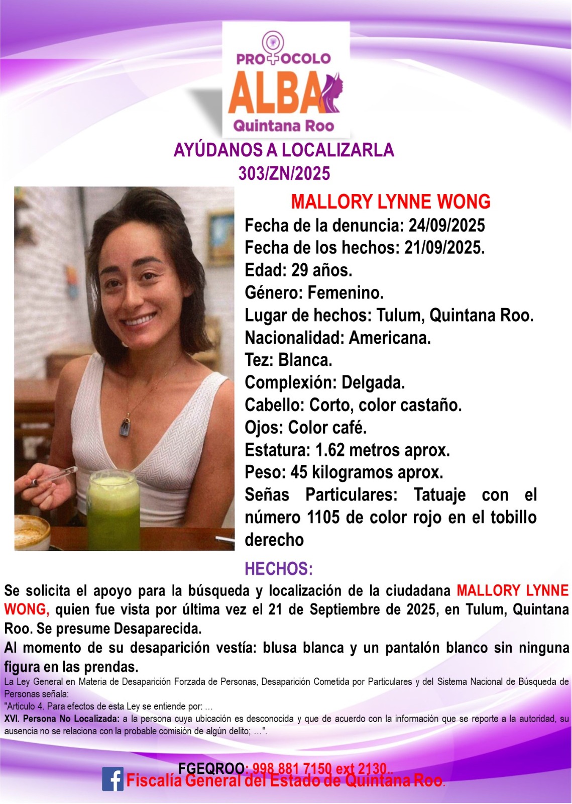 La #FGEQuintanaRoo activa ficha de búsqueda de Mallory Lynne Wong, vista por última vez el 21 de septiembre de 2025, en el municipio de Tulum, Quintana Roo. Si tiene datos de su paradero comunicarse al 998 8817150 ext.2130.#ProtocoloAlbaQRoo pic.twitter.com/eyqO0KJuIW