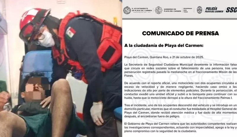 Desmienten muerte tras persecución en Playa luego de que el Ayuntamiento de Playa del Carmen, a través de la Secretaría de Seguridad Ciudadana Municipal, aclarara la información que circulaba en redes sociales sobre el presunto fallecimiento de una persona durante una persecución pasada la medianoche en el fraccionamiento Misión de las Flores.