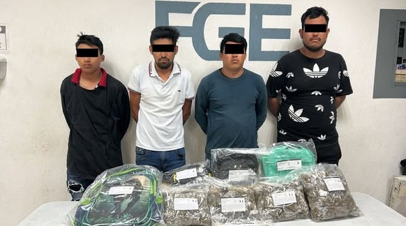 En el municipio de Puerto Morelos, fueron detenidos Vicente Alejandro “N”, Ernesto “N”, Diego Armando “N” y Luis Ángel “N”, quienes fueron sorprendidos manipulando hierba verde y seca con características similares a la marihuana en la calle 8, entre calle 7 y una vía sin nombre, de la colonia Invasión.