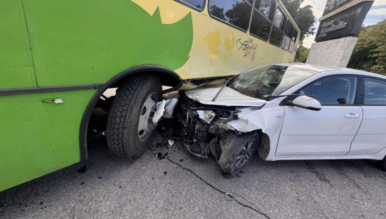 El conductor del autobús se atravesó en ambos carriles de circulación, justo cuando un vehículo Kia Rio blanco, que viajaba a alta velocidad, se desplazaba por la vía. El automóvil se impactó fuertemente contra el costado del autobús, quedando parcialmente debajo de la unidad y sufriendo graves daños en la parte frontal.