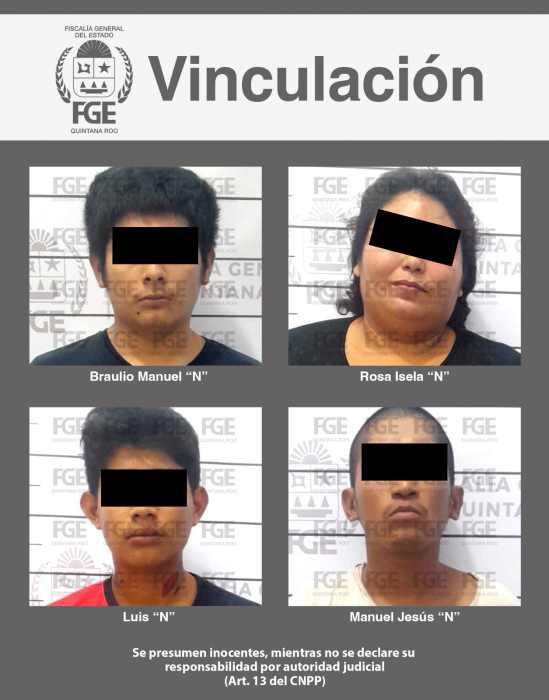 Imputan a cuatro por drogas en Tulum. La Fiscalía General del Estado logró la vinculación a proceso de Rosa Isela “N”, Luis “N”, Manuel Jesús “N” y Braulio Manuel “N” por su presunta participación en delitos contra la salud en su modalidad de narcomenudeo. Tras presentar los datos de prueba ante un juez de control, se determinó que los cuatro acusados continuarán el proceso en prisión preventiva. En Cambio Diario te trae los detalles.