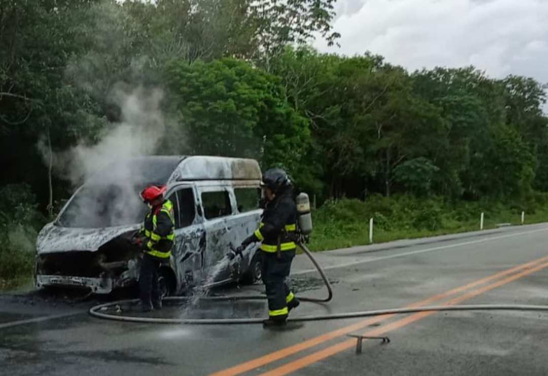 Incendio de van turística en tramo Tintal-Playa del Carmen deja solo daños materiales. El incidente ocurrió alrededor de las 6 de la tarde y dejó únicamente daños materiales, sin que se reportaran heridos.