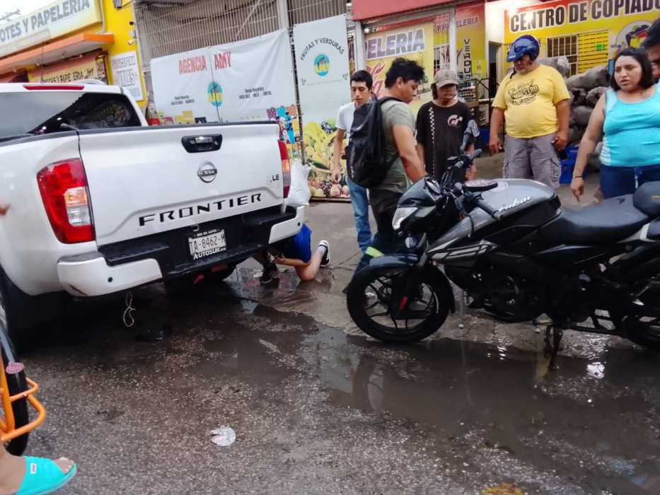 Al intentar esquivar el vehículo, el motociclista perdió el control, derrapó y terminó debajo de una camioneta estacionada.