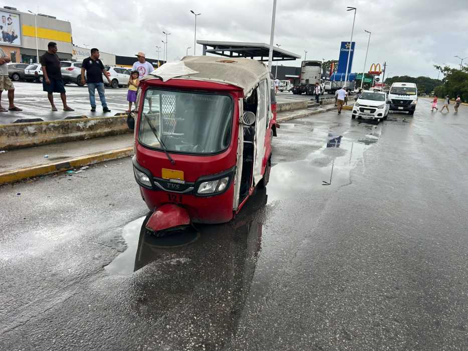 La tarde de ayer martes, un mototaxi cae en coladera abierta y deja tres lesionados en Playa del Carmen, luego de que la unidad terminara atrapada en un registro sin tapa ubicado frente a la plaza de Villas del Sol. El accidente ocurrió cuando el vehículo circulaba por una vialidad afectada por encharcamientos, lo que impidió al conductor detectar el peligro a tiempo.