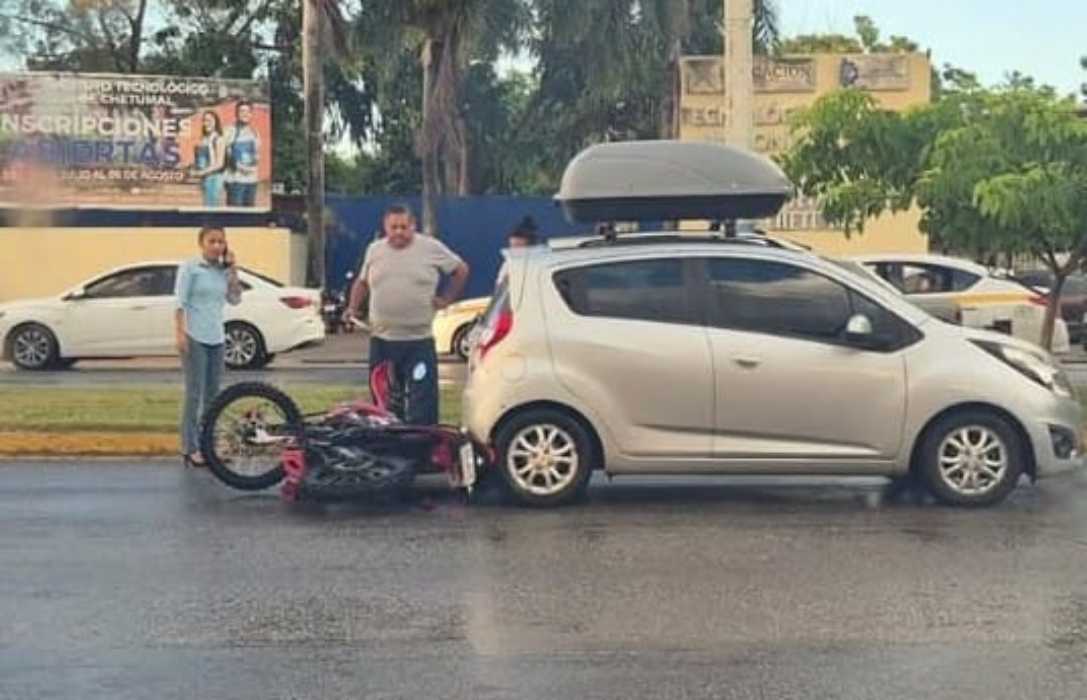 Esta mañana, una mujer resulta lesionada tras chocar su motocicleta contra un auto en avenida Insurgentes, Chetumal. Según testimonios de testigos presenciales, la motociclista no alcanzó a frenar a tiempo, lo que provocó la colisión.