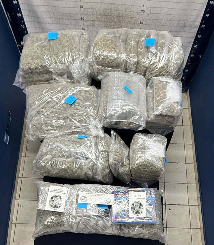 Al realizar la inspección correspondiente, los oficiales aseguraron múltiples paquetes que contenían vegetal verde y seco con características propias de la droga conocida como marihuana.
