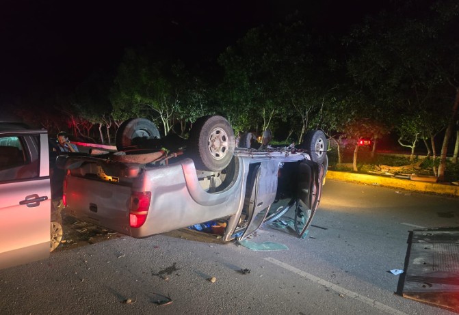 El impacto por alcance provocó que la camioneta JMC fuera proyectada contra el camellón central, resultando con severos daños en la parte trasera. Mientras tanto, la Toyota Hilux perdió el control, se desplazó de costado y terminó volcada con las cuatro llantas hacia arriba, generando una situación de alto riesgo para otros automovilistas que circulaban por la zona.