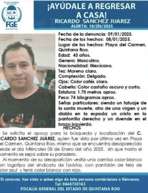 Según la ficha de búsqueda emitida por la Fiscalía General del Estado (FGE), Ricardo fue visto por última vez el pasado 8 de enero en Playa del Carmen, vistiendo una camisa blanca con el logotipo del sindicato de taxistas, pantalón azul y tenis blancos con detalles rojos.