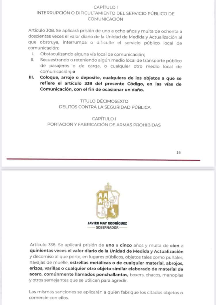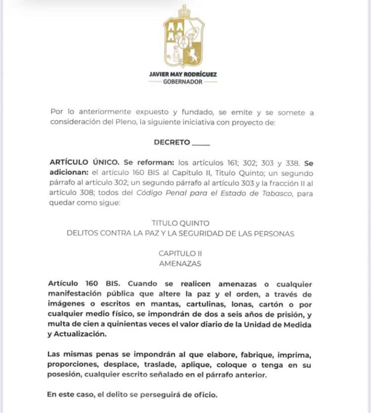 La propuesta incluye la modificación de varios artículos del Código Penal de Tabasco, estableciendo penas de dos a seis años de prisión y multas de 100 a 500 UMAs (Unidad de Medida y Actualización) para quienes realicen amenazas o cualquier manifestación pública que altere el orden, a través de mantas, cartulinas, lonas u otros medios físicos.